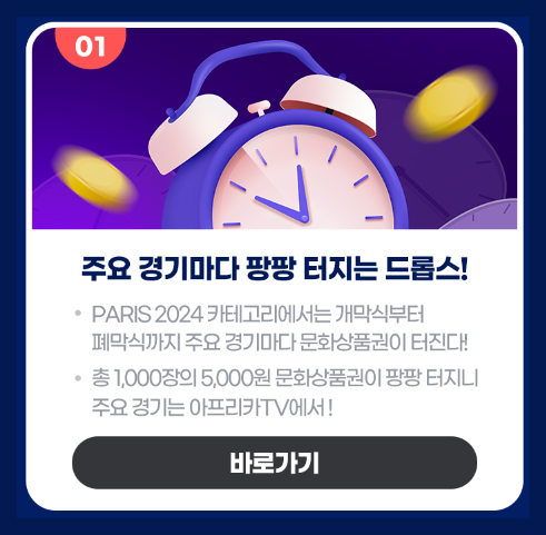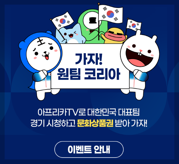 아프리카 TV에서는 파리올림픽 대한민국 대표팀을 응원하고 시청자참여를 통해 다양한 상품을 선물로 받을 실 수 있으니 확인해 보시기 바랍니다.