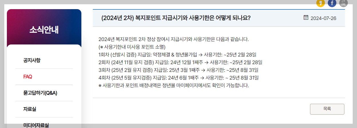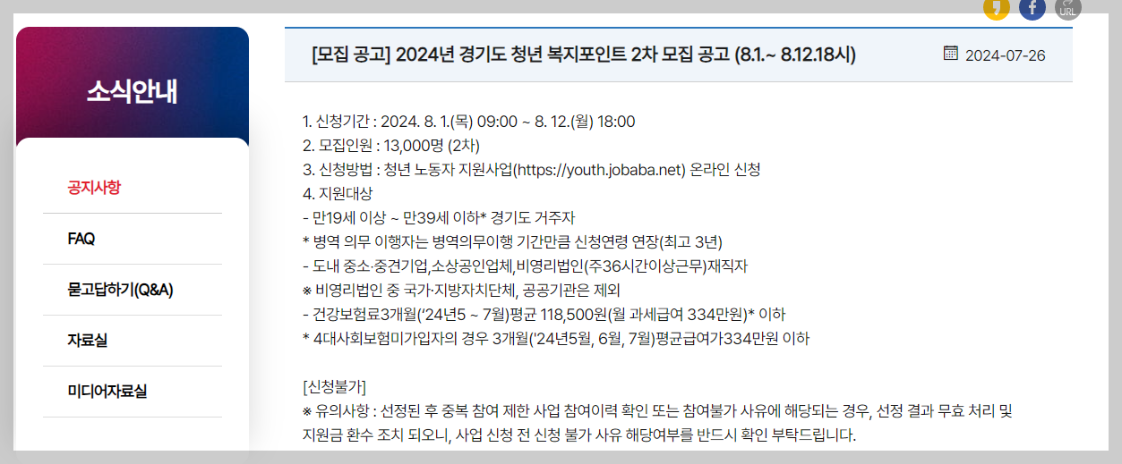 - 경기도 청년복지포인트 신청 기간 : 2024년 8월 1일 (목) 09:00 ~ 2024년 8월 12일 (월) 18:00