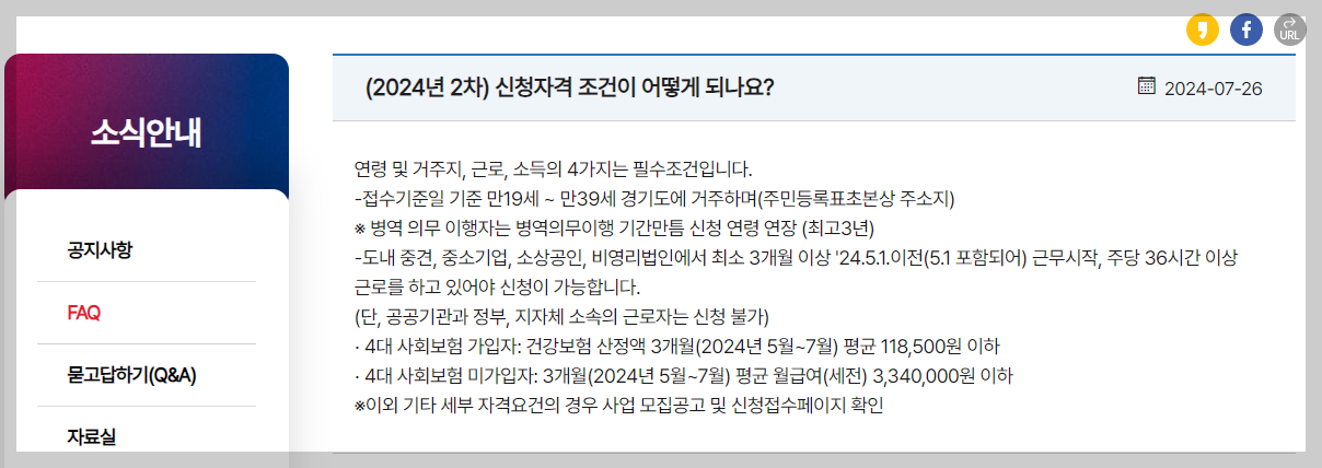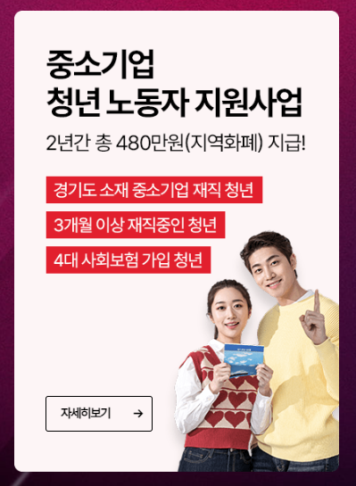 - 근무조건 : 경기도 소재 중소‧중견기업, 소상공인업체, 비영리법인(주 36시간 이상 근무) 재직자