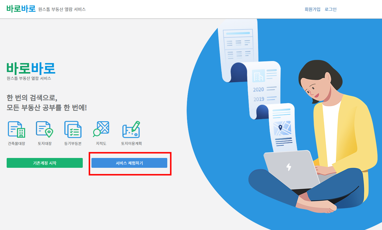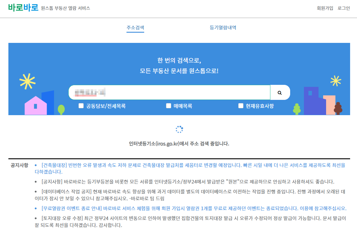주소 입력만으로 등기부등본, 건축물대장, 토지이용계획 등 다양한 서류를 한 번에 조회할 수 있는 플랫폼입니다. 과거에는 열람 이력이 있는 등기부등본을 무료로 제공하기도 했으나, 현재는 무료 열람권을 제공하지 않습니다.